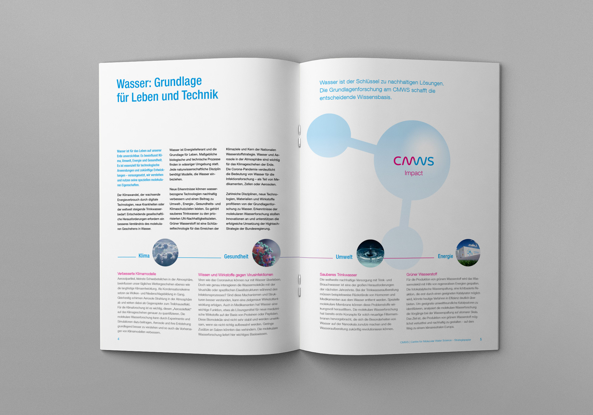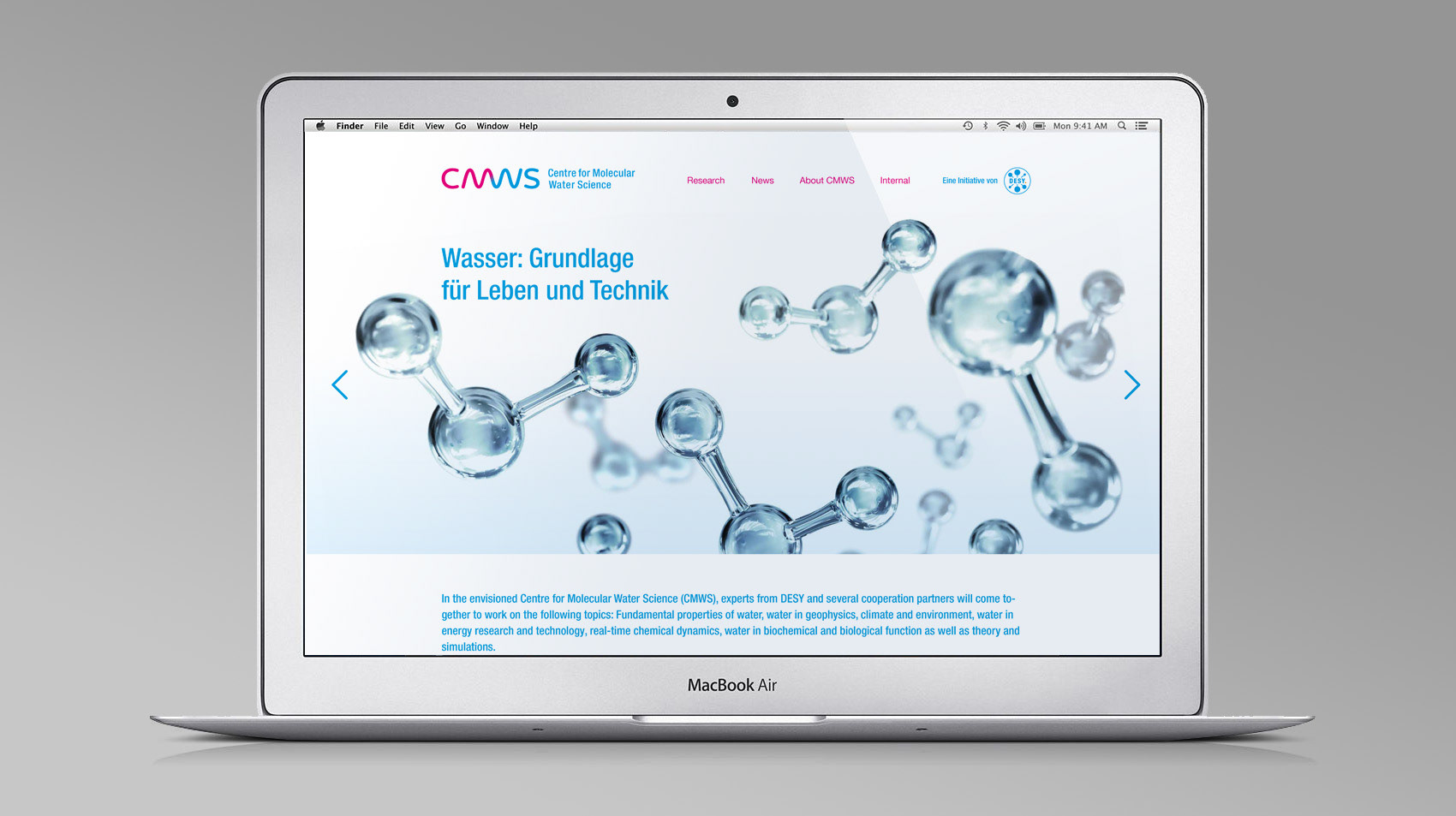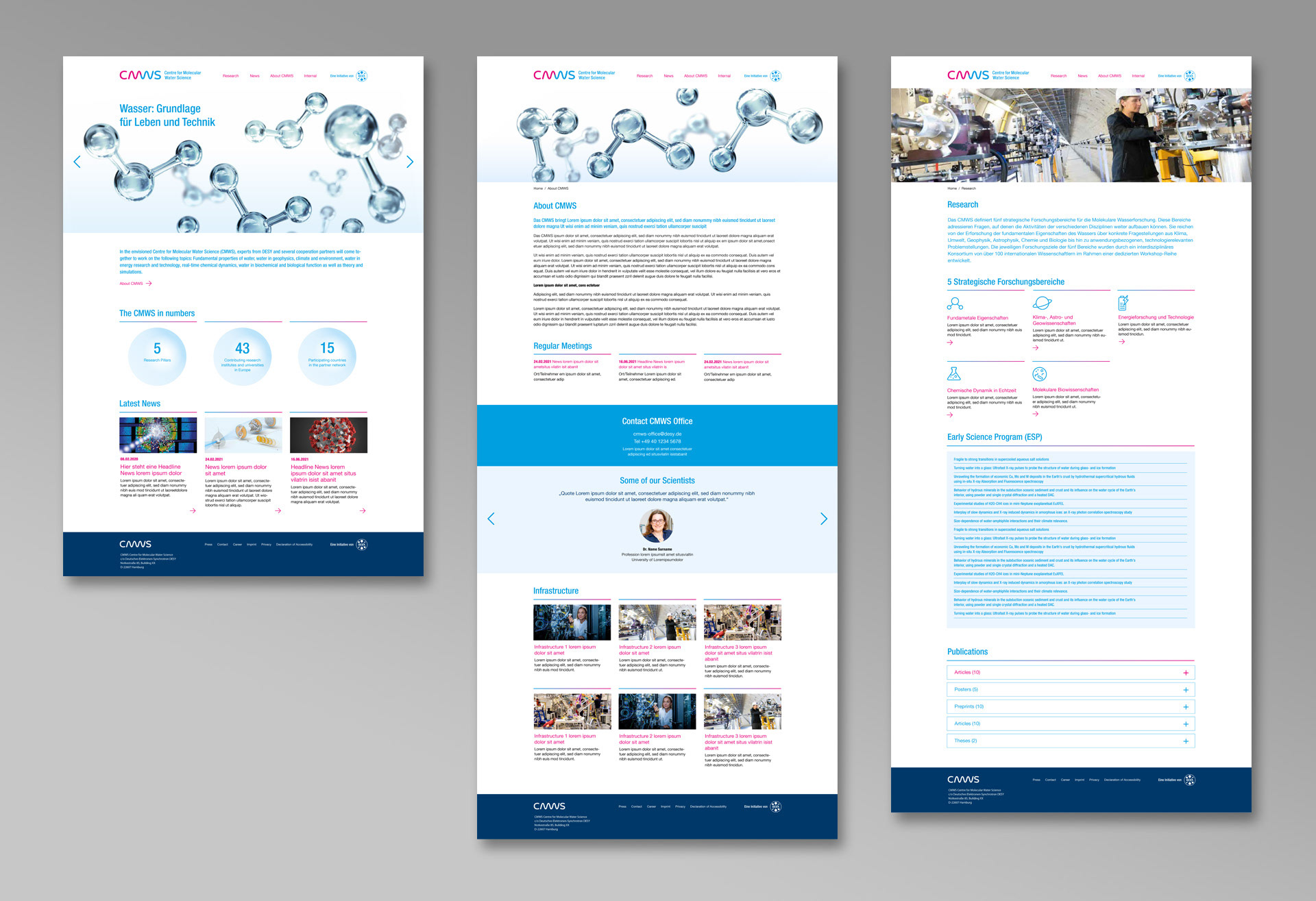 Logoentwicklung und Designauftritt für das von DESY initiierte „Centre for Molecular Water Science“ (CMWS). Das CMWS ist ein paneuropäisches Konsortium internationaler Schlüsselpartner aus verschiedenen Wissenschaftsbereichen (Physik, Chemie, Biologie) mit dem gemeinsamen Ziel, ein detailliertes molekulares Verständnis von Wasser zu erreichen.